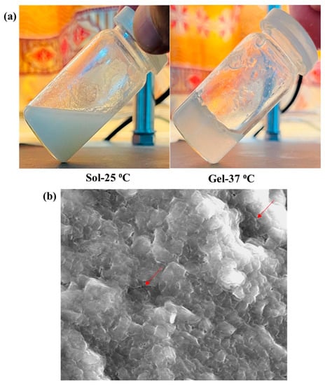 (a) Sol-Gel transition and (b) SEM of 5FU-Alg-Np-HG.