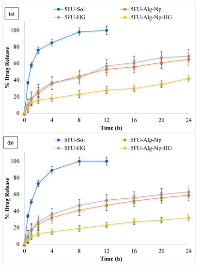 Release profile of 5FU at (a) 32 °C and pH 5.5; (b) 37 °C and pH 7.4.