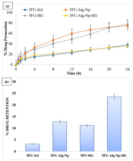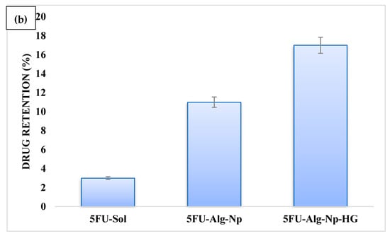 Ex vivo permeation studies were conducted for the formulations across the rat’s skin. The permeation of 5FU across the skin was higher in the case of nanoparticles as compared to hydrogels (ANOVA, p < 0.05) (Figure 7a). This was due to the smaller size and negative charge of the nanoparticles. However, when comparing nanoparticles vs. hydrogels, it was found that the permeability of 5FU was weaker when incorporated in gel. This was due to the additional processes of diffusion of 5FU from the gel base. The permeability of simple hydrogel was also higher than the 5FU-Alg-Np-HG. This was due to the lower release of 5FU from 5FU-Alg-Np-HG. Skin has the complex structure and acts as the main barrier against the entry of foreign chemicals. The stratum corneum, the outermost layer of skin, has highly organized structure and is main barrier and hence hinders drug penetration. The polymers, i.e., alginate and chitosan, are the main components of nanoparticles and hydrogels, play a role in determining drug permeation. Alginate and chitosan both interact with skin components proteins and lipids and helps in drug permeation. Chitosan as a matrix-forming polymer was also previously used for topical hydrogel formulations due to its permeation enhancer properties. Chitosan reversibly fluidizes the skin lipids and proteins, which results in the permeation of 5FU [].