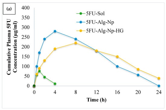 The mean plasma drug concentration vs. time was plotted and is shown in Figure 8. It was observed that hydrogels (5FU-Alg-Np-HG) controlled the release as effectively as pharmacokinetic parameters when compared to nanoparticles (5FU-Alg-Np) and solution (5FU sol). Short tmax and Cmax values were observed for 5FU sol, this was due to inability of solution to penetrate the skin. The Cmax was slightly higher for 5FU-Alg-Np as compared to hydrogels. This was attributed to the smaller size, higher drug release and ex vivo permeation of nanoparticles. The half-life and AUC were found higher in case of 5FU-Alg-Np-HG as compared to other formulations. The longer half-life shows prolonged delivery of 5FU from the hydrogel in comparison to solution and nanoparticles. The t1/2 of the drug is an important parameter and it controls the degree of drug accumulation, concentration fluctuations and the time taken to reach equilibrium []. Findings from our study reflect an important indication on the in-vivo sustained performance of hydrogels (5FU-Alg-Np-HG) after single application. Hence, the frequency of the dosage regimen, patient compliance and continuation of treatment for long time could be enhanced markedly by using 5FU-Alg-Np-HG. These findings are in correlation with the in vitro and ex vivo studies. Skin-related drug retention was significantly higher when 5FU-Alg-Np-HG was applied on the rats skin (ANOVA, p < 0.05). Higher skin-related drug retention is helpful in treating local skin cancers.