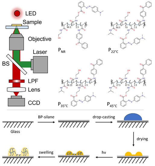 Top left: Sketch of the optical setup used in photoactuation experiments including laser, light-emitting diode (LED), objective, sample, dichroic beamsplitter (BS), longpass filter (LPF), lens, and charge-coupled device (CCD) camera; Top right: Structures and monomer feed composition of the different non-thermoresponsive (PNR) and thermoresponsive copolymers (P22°C, P35°C, P45°C) employed in this study; Bottom: Sample preparation process of o-methyl red-containing hydrogels for photoactuation experiments, involving functionalisation of the glass surface with a silane of the photocrosslinker benzophenone, drop-casting a solution of the respective copolymer, drying, photocrosslinking, and subsequent swelling.