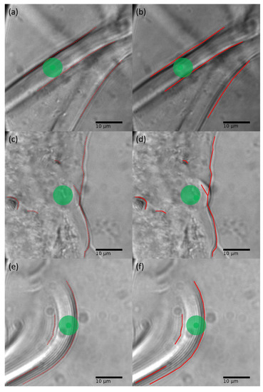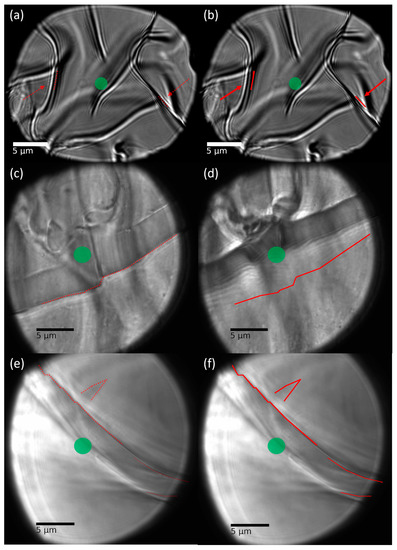 Light microscopy images of pristine (left panels) and photoactuated regions (right panels) of hydrogel layers prepared from (a,b) poly(NipAAm86.5%-HEAm10%-co-o-MREAm2.5%-co-BPAAm1%) P22°C, (c,d) poly(NipAAm56.25%-HEAm40.25%-co-o-MREAm2.5%-co-BPAAm1%) P35°C, and (e,f) poly(NipAAm27.5%-HEAm67.5%-co-o-MREAm2.5%-co-BPAAm2.5%) P45°C. Photoactuation was performed with a laser at λ = 532 nm and 3750 µW (irradiation region marked by a green spot). Red lines indicate notable gel features that were photoactuated.