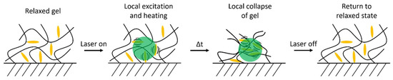 Cartoon of the photoactuation process of thermoresponsive o-methyl red-containing hydrogels. Local excitation of dye side chains by laser irradiation induces heating, which leads to a local collapse and deformation of the gel. The gel returns to its original conformation when the laser is shut off and the heat is dissipated to the environment.
