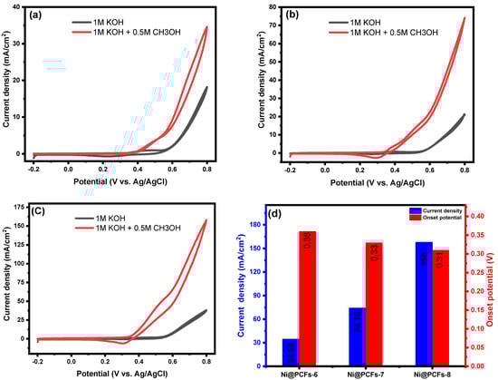 | Ni@PCFs-6 | CH3OH (0.5M)/KOH (1M), E = 0.8 V vs. Ag/AgCl, ν = 0.05 V/s | 34.58 | This work |