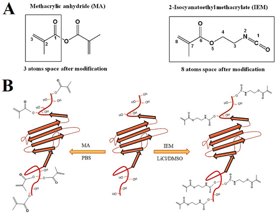 (A) Chemical structure of methacrylic anhydride (MA) and isocyanatoethyl methacrylate (IEM) showing the three- and eight-atom linkers after modification, respectively. (B) Modification of sericin through its hydroxyl groups with MA in PBS and with IEM in DMSO with LiCl as the catalyst to form hydrogels through photo-polymerization.