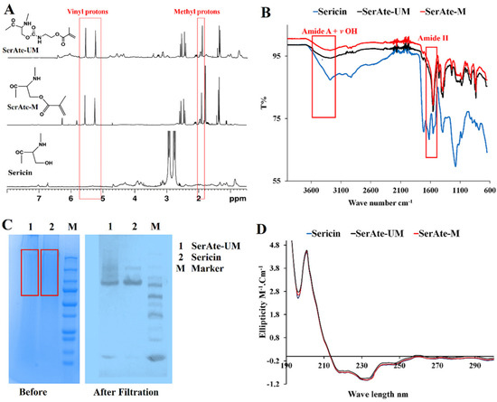 1H-NMR (A), IR (B), and CD (D) spectra of sericin (blue), SerAte-M (red), and SerAte-UM (black) in the wavenumber range of 4000–600 cm−1; SDS-PAGE (C) of SerAte-UM (1), sericin (2), and the standard protein MW markers (M) before and after filtration. The value of each standard MW for protein markers is provided in (C).