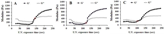 The effect of UV exposure time on the storage (G′) and loss (G″) moduli of 15 wt% SerAte-UM precursor solution with degree of modification of 24% (A), 31% (B), and 40% (C). The red circles show the gelation time at which G′ = G″.