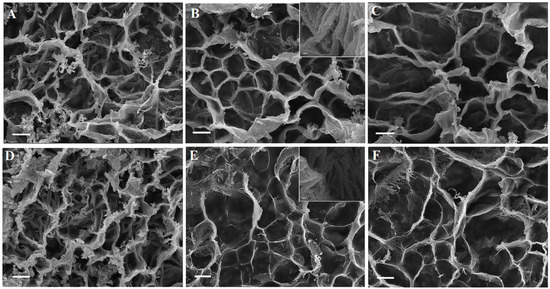 SEM images of lyophilized 15 wt% SerAte-UM hydrogels with degree of modification of 24% (A), 31% (B), and 40% (C) at 1100× magnification. SEM images of lyophilized 15 wt% SerAte-M hydrogels with degree of modification of 24% (D), 31% (E), and 40% (F) at 1100× magnification. The insets in (B–E) show higher magnification (3000×) SEM images of SerAte-UM and SerAte-M hydrogels, respectively, with 31% degree of modification. The scale bar in (A–F) is 10 µm and that in the insets of (B,E) is 0.5 µm.