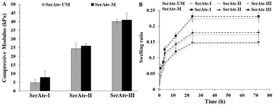 Effect of degree of modification on compressive modulus (A) and swelling ratio in PBS (B) of SerAte-UM and SerAte-M hydrogels (15 wt% SerAte) at ambient conditions. SerAte-I, SerAte-II, and SerAte-III correspond to SerAte hydrogels with 24%, 31%, and 40% degree of modification, respectively. The values are expressed as means ± SD for n = 3.