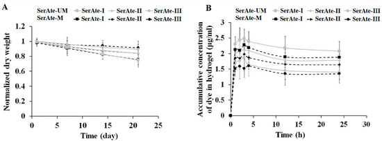 Effect of degree of modification on mass loss (A) and dye uptake (B) of SerAte-UM and SerAte-M hydrogels (15 wt% SerAte) in PBS at ambient conditions. The values are expressed as means ± SD for n = 3.