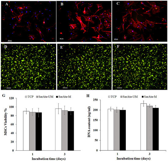 DAPI- and phalloidin-stained images of MSCs seeded on adherent polystyrene tissue culture plate (TCP) and SerAte-UM and SerAte-M hydrogels are shown in Figure 7A–C, respectively. Images B and C in Figure 7 show the elongated spindle-shape morphology of MSCs on SerAte-UM and SerAte-M hydrogels, consistent with previous reports on the morphology of MSCs on keratin-based hydrogels [9]. The SerAte hydrogels presumably facilitated cell attachment through serine-rich repetitive sequences [41]. The higher intensity of actin filament staining in Figure 7B indicated stronger interaction of surface receptors of MSCs with adhesion ligands on the surface of SerAte-UM hydrogel compared to TCP and SerAte-M hydrogel. Figure 7D–F show live (green) and dead (red) stained images of MSCs seeded on TCP, encapsulated in SerAte-UM and in SerAte-M hydrogels (15 wt% SerAte, 31% degree of modification), respectively, after three days of incubation in basal medium. The images show a high fraction of viable MSCs three days after encapsulation in SerAte hydrogels. It should be noted that TRITC-phalloidin, used in adhesion experiments (images A–C), stains the filamentous F-actin in the cell cytoplasm, thus imaging the spread morphology of the cells as delineated by actin filaments. By contrast, Calcein-AM, used in viability experiments (images D–F), permeates the cell membrane and is converted to fluorescent Calcein by reaction with intracellular esterase, thus imaging only cell viability by fluorescing green and not cell shape.