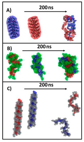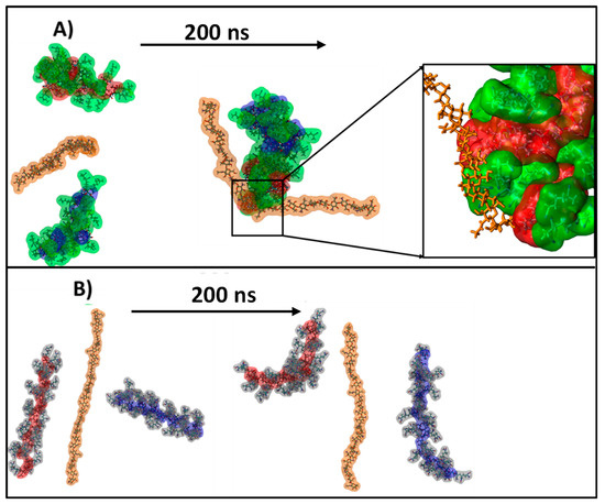 The amylose starch molecules start with separated conformation, with a distance between the two molecules of >20 Å, to eliminate any bias in the interaction that could take place. After 200 ns, it can be observed in Figure 2A,B that the unfunctionalized and the SgAN molecules are interacting with each other, while the SgAx molecules remain separate. The unfunctionalized starch molecules are wrapped around each other in a way that is similar to a double-helical structure (Figure 2A). Similar observations were found in the literature [41], which also showed that this association could have two main crystal forms, A and B, as already observed for our starch samples in Figure 1C. The AN grafted starch behaves in a similar manner to the previous system, with the main starch chains wrapped around each other and the side chains exposed to the exterior (Figure 2B). The Ax functionalized starch behaves differently to the other investigated starch, in that the molecules remain isolated for the entire simulation (Figure 2C). The structures obtained in the MD simulation corroborate well with the XRD result (Figure 1C). In detail, in the case of the unfunctionalized starch molecules, the amylopectin crystalline part of the starch, and also the amylose part, can interact with each other and assemble in structures that are precursors to the A or B type patterns. In the case of the SgAN, although the amylose main chains interact with each other in a similar way to the previous system, the side chains located at the exterior and the absence of amylopectin leads to a decrease in crystallinity. Thus, the reflection peak (100) at around 17° observed in all SgAN samples (Figure 1(bC)) can be ascribed to the remaining organization of the starch main chains while the AN side chains determine a loose structure. In the case of SgAx, the MD simulation clearly depicts the V-type pattern of single starch molecules in an extended conformation.