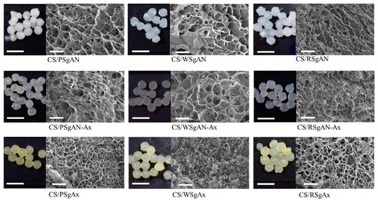 The composite hydrogel beads formation follows two routes, which include using SgAN or SgAx as precursors and obtaining three types of composite beads, CS/SgAN, Cs/SgAN-Ax and Cs/SgAx (see details in Section 4.3). The beads are sphere shaped, as observed in the optical images of wet beads, and are porous, as shown by the SEM images of the surface of lyophilized beads (Figure 3).