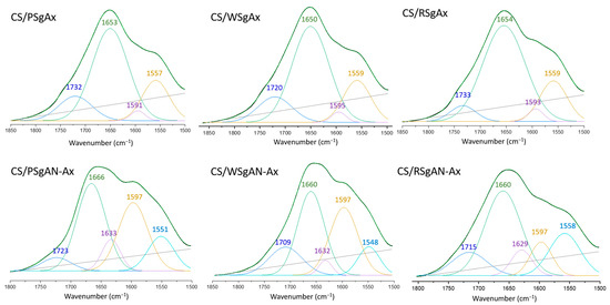 Further proof of the samples’ chemical structure was obtained by FTIR and is shown in Figures S1–S3 (supplementary information), where the characteristic peak of AN is observed just in the CS/SgAN samples and the characteristic peaks for starch and CS are found in all the spectra. Nevertheless, as shown in previous studies [36], the formation of amidoxime can be demonstrated in FTIR at about 1650 cm−1 or 933 cm−1, assigned to the C=N and N-O bonds in oximes, respectively. Therefore, the 1800–1500 cm−1 area was selected and the peak deconvolution was performed for both types of amidoximated beads, CS/SgAN-Ax and CS/SgAX (Figure 5, Table S1).