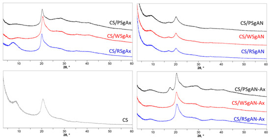 The chitosan sample shows diffraction peaks at about 9° and 20° (2θ), which could be found in all the samples after hydrogel bead formation, as shown in Figure 6. In addition, the diffraction peak at 17° (2θ), characteristic for grafted starch (Figure 1(bC,cC)), was observed in the CS/SgAN samples and was also found after their amidoximation for beads obtained with PSgAN. For the samples obtained with the other AN-grafted starch (RS and WS) and that with SgAx, the peak at 17° (2θ) was not observed, with the peak at about 9° being evident mainly in CS/RSgAx beads. To conclude, the X-ray diffraction analysis showed that the samples prepared by the two methods, either using SgAN and beads post amidoximation or by using SgAx, still contain the functionalized starch structures, suggesting good incorporation of functionalized starch dispersion into the beads.