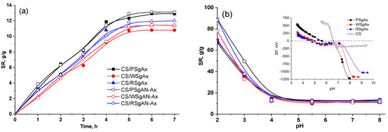 Swelling of the composite hydrogel beads as a function of time at pH = 6 (a) and different pH values (b); inset in (b) potentiometric titration curves of SgAx and CS.