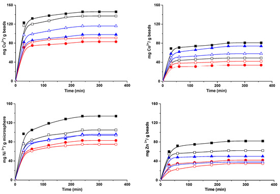 Composite hydrogel beads with amidoximated groups (CS/SgAN-Ax and CS/SgAx) were tested as supports for the uptake of Cu2+, Co2+, Ni2+ and Zn2+ ions from aqueous solutions, in batch experiments. The influence of contact time on the hydrogel beads’ sorption capacity for metal ions is represented graphically in Figure 8, and shows that the time required to reach the equilibrium was about four hours for all the studied metal ions. For each metal ion, the hydrogel beads’ sorption capacity was influenced by the nature of the starch used to obtain the beads and the manner in which the beads were obtained. Nevertheless, the best sorption capacity for the investigated ions was obtained when CS/PSgAx hydrogel beads were used, with the highest affinity to Cu2+. Furthermore, with some exceptions, the beads obtained with SgAx show better sorption capacities for the investigated ions, as compared to the beads post-amidoximation, following the same trend as that found for the beads’ swelling vs. time (Figure 7a). For each sorbent, the beads’ affinity for the tested metal ions follows the same order, which is as follows: Cu2+ > Ni2+ > Zn2+ ≈ Co2+.