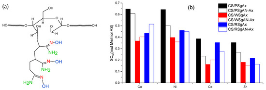 (a) Schematical representation of the three active sites (colored) of amidoxime functional group and (b) sorption capacity of hydrogel beads CS/SgAN-Ax or CS/SgAx expressed as moles of metal (Me)/moles of active sites (AS) in hydrogel beads.
