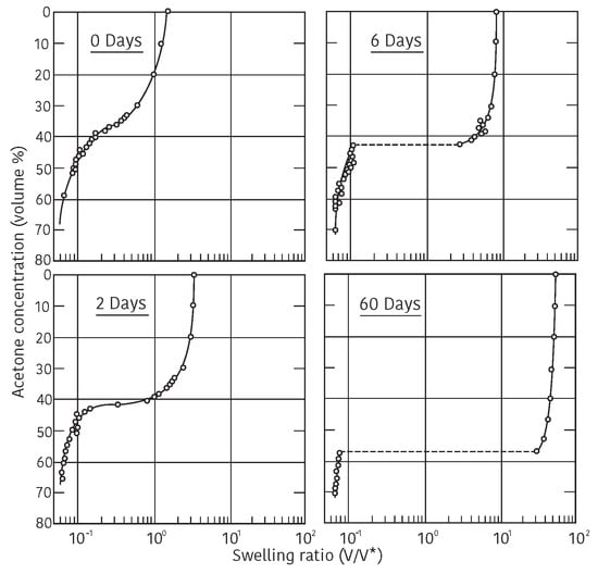 The volume phase transition of ionic poly(acrylamide) gels. The equilibrium swelling ratio of the gels in the mixed solvent system of water and acetone. The time of hydrolyzed reaction are given in the figure as, for instance, 6 Days. Reproduced with permission from Ref. []. © 1986, The Physical Society of Japan.