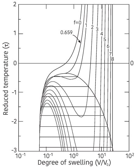 The theoretical swelling curve of gel calculated by Equation (8). The swelling curves are calculated for various values of ionic component on the active chain of the gel, f. Reproduced with permission from Ref. []. © 1986, The Physical Society of Japan.