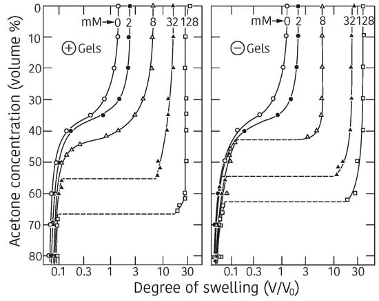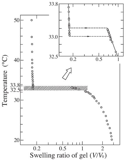 In 1978, however, Tanaka discovered a new phenomenon that the volume of poly-(acrylamide) gel changes discontinuously at a certain conditions []. In this study, he realized the important roles played by the ionic group on the polymer chain. He, then, studied the swelling behaviors of gel by changing the ionization of the polymer network of the gel systematically []. The results are shown in Figure 1. The hydrolyzed poly(acrylamide) gels in alkaline solution are employed in this study. The degree of ionization of polymer chain is changed by changing the duration of hydrolyze reaction. The results obtained in these earlier studies are, therefore, not quantitative enough. The quantitative studies on the effects of the ionic group in the polymer chain is made later. However, the characteristic features of the volume phase transition of gel are well shown in these experimental results: for instance, the presence of the critical point, the temperature dependence of the transition point, the degree of volume change at the transition point, and so forth. The behaviors of the characteristic features can be intuitively explained by the effects of the ionic group in the polymer network. This is the discovery of the volume phase transition phenomenon in polymer gels. He, then, establish the theory of the volume phase transition of gel to describe the experimental results.