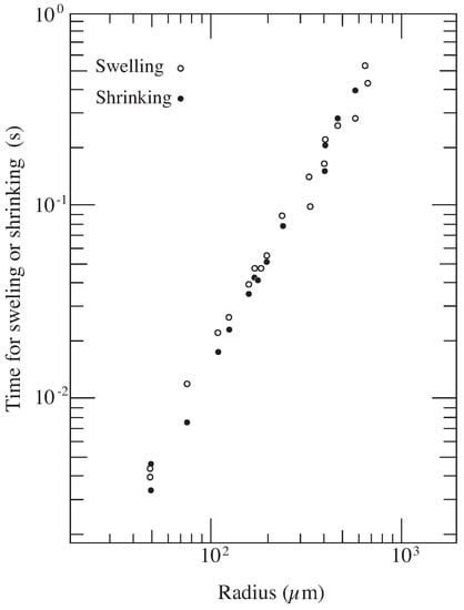 Swelling time and shrinking time of gels. The measurements are made in poly(N-isopropylacrylamide) gel particles []. Reproduced with permission from Ref. []. © 1986, The Physical Society of Japan.