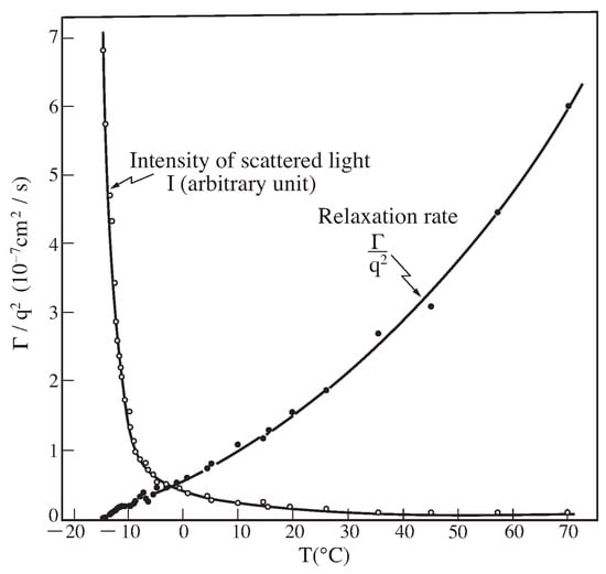 where f represents the friction coefficient between the polymer network of the gel and the solvent. Here, represents the scattering vector. The result, above Equation (19), was confirmed by measuring the correlation function of light scattered from poly(acrylamide) gel in water []. The temperature dependence of the light scattering revealed the critical behavior in poly(acrylamide) gel as shown in Figure 7 []. Tanaka made this study before the discovery of the volume phase transition of gel. The intensity of the scattered light diverges and the relaxation time slows down to zero as the temperature approaches the critical point. The results indicate that the fluctuations of polymer network increases to infinity and the relaxation rate slows down infinitely. The gel becomes opaque as a results of non-uniform spatial density distribution of the polymer network in the vicinity of the critical point. The opacity of the gel, however, disappears and the gel becomes transparent reversibly when the distance from the critical point is increased. It is found that the divergence of the fluctuation of the polymer network is well explained by the mode-mode coupling theory [].