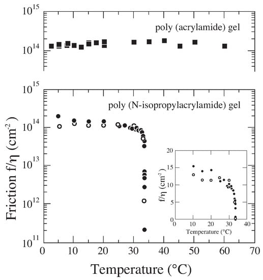These results, Equations (21) and (22), are consistent because . It is, however, extremely desirable to measure the friction coefficient of gel in the vicinity of the critical point of the gel, though it can be estimated from the collective diffusion coefficient and the longitudinal elastic modulus of the gel by Equation (20). The experimental study of the critical behavior of the friction coefficient of the gel was made much later than the finding of the critical phenomena of the gel. A new apparatus for the friction measurement should be constructed, and then, the frictional properties of gels were studied [,]. The results are given in Figure 8. In this figure, the friction coefficient of the gel is normalized by the viscosity of water, , because the flow rate of water depends on the viscosity of flowing fluid. The friction of the poly (acrylamide) gel is almost constant in the temperature region studied. In contrast, the friction of poly(N-isopropylacrylamide) gel decreases about three orders of magnitude in the vicinity of the volume phase transition temperature of this gel, °C. We finally find the critical behavior of friction
