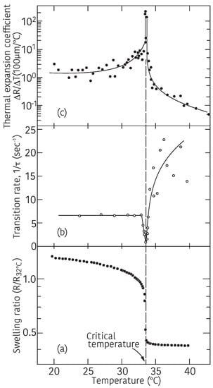 - Tanaka, T.; Sato, E.; Hirokawa, Y.; Hirotsu, S.; Peetermans, J. Critical kinetics of volume phase transition of gels gels. Phys. Rev. Lett. 1985, 55, 2455–2458. [Google Scholar] [CrossRef] [PubMed]