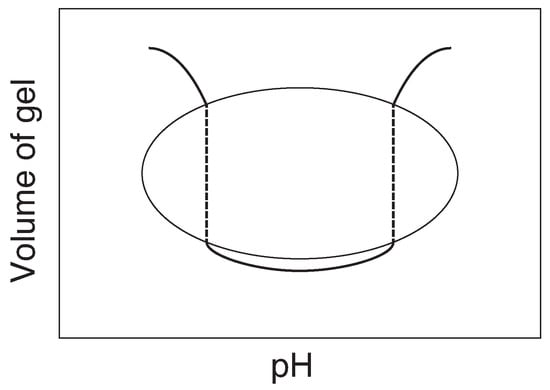 The third example is related to the last project of Tanaka. When we discuss in the section of the volume phase transition of various gels, we left the experimental results about the volume phase transition of gel due to the electrical charges. It may be natural to design the gel that contains both positively charged segments and negatively charged segments to clarify the effects of the interaction between electrical charges of polymer chain on the volume phase transition of the gel. The concentration of proton, i.e., pH, may also be the natural choice of the external variable to observe the volume phase transition in such gels. It is reasonably assumed that the gel that contains both the positively charged segments and the negatively charged segments swell both at lower and higher pH regions and it collapses into compact state in the intermediate pH region because we know that either positively and negatively charged gels swell lower pH region and higher pH region, as shown in Figure 10 schematically. He, however, discovered entirely new volume phase transition phenomena in the gels that contains both the positively charged segments and the negatively charged segments, namely, multiple volume phase transition of the gel []. The gel shows many stable swollen state against pH change. The phenomenon is believed to occur by the cooperative interaction between the hydrogen bonding, the repulsive force between the same charges, and the attractive force between opposite charges. The similar behaviors were observed in the chemically cross-linked biopolymer gels. A totally new idea was born in Tanaka’s mind through the studies of the multiple phases of gel. He found the similarity of the origin between the multiple volume phase transition of gel and the structure transition in the heteropolymer system. He, then, moved to study the phase transition of the heteropolymer systems theoretically [,]. After these studies, his idea was expanded to establish the molecular recognition system by the heteropolymer gel with the idea of imprinting; such system are known only in biological molecules as proteins. He wanted to prepare a heteropolymer gel in which some information is imprinted within its structure in such a way that some degree of molecular self-assembly would be achieved in the shrunken state of the gel. He actually make significant progress in this direction [,]. It was demonstrated experimentally in some heteropolymer gels that imprinted molecular information leads to minimize the frustrations in the gel. Nevertheless, this program remains incomplete. Some researchers pointed out that the imprinting of information has very little chance to succeed and some were skeptical about his idea. However, I believe that Tanaka was seeing the answer for the problem of “what is life” behind the research of heteropolymer gels. Tanaka sometime expressed this problem as “the origin of life”. Apart from such a big problem, we believe that above ambitious studies will open a new insight into the gel science as well as the life science. Although the path to success may be narrow and steep, young scientists should try it. The big scientific achievements are not found on convenient paved roads as suggested by Feynman in the title of his book, “Perfectly reasonable deviations from the beaten track”. Tanaka left many seeds of science to be solved. I believe that solving of these problems will contribute to the deeper understanding of the gel science.