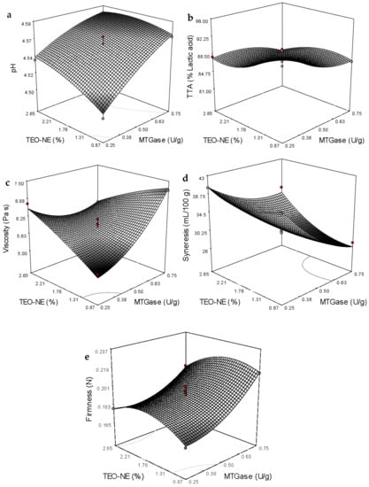 The ANOVA showed that the effect of TEO/SFO was stronger than tween-80 on the particle size and PDI results (p < 0.05). In general, an increase in the concentration A (Table 5) illustrates that the linear effect of MTGase concentration on all the response variables was highly significant (p < 0.0001). Except for the apparent viscosity, the addition level of TEO-NE to non-fat yogurt gels linearly affected the other response variables. The interaction effect of these two independent variables was also significant in all the response variables (Table 5). The quadratic effect of TEO-NE enrichment quantity was insignificant on the apparent viscosity. However, the quadratic term of MTGase concentration was significant in all the studied physicochemical quality responses (Table 4). Based on the sum of squares (Table 5) and coefficients in the fitted equations (Table 4), the linear term of MTGase concentration was the most significant (p < 0.05) effect on the pH, firmness, and syneresis. Moreover, the most significant effect on the total titratable acidity (TTA) value was revealed to be the quadratic effect of TEO-NE and the linear term of MTGase concentration. Likewise, the interaction between MTGase and TEO-NE had the maximum effect on the apparent viscosity of free-fat yogurt gels (Table 4 and Table 5). Figure 3a,b show that an increase in the incorporation level of MTGase and TEO-NE reduced the TTA and increased the pH value of yogurt gels. Adding the MTGase remarkably increased the viscosity and firmness, while a significant decrease in the syneresis was recorded at high MTGase levels (Figure 3c–e). The syneresis could be increased by increasing the incorporation level of TEO-NE (Figure 3e). Adversely, a decrease in the firmness was measured in yogurt gels containing a high TEO-NE percentage (Figure 3c).