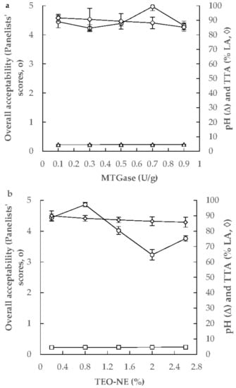 Changing the TTA, pH, and overall sensory acceptability of yogurt gels as a function of MTGase (0.1–0.9 U/g, with 0.75% TEO-NE) (a) and TEO-NE (0.2–2.6%, with 0.70 U/g MTGase) concentrations (b).