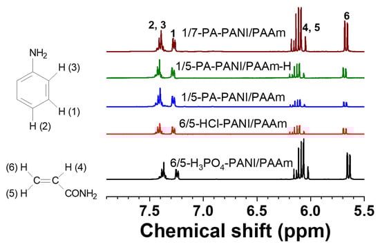 Quantitative analysis was further executed to evaluate the simultaneous polymerization. First, 5 mg of the above dry gels was soaked in D2O for 6 h, and the 1H NMR spectra of the liquid extracts were recorded. Shown in Figure 1 are the local spectra, where the signal from D2O was used as the inner standard with its integrate height adjusted to the same. The amounts of residual AAm and ANI monomers varies with the condition of simultaneous polymerizations. From the integrate height, the ratio of ANI monomer in the five extracts of 1/7-PA-PANI/PAAm, 1/5-PA-PANI/PAAm-H, 1/5-PA-PANI/PAAm, 6/5-HCl-PANI/PAAm and 6/5-H3PO4-PANI/PAAm is 2.11:2.50:1.92:1.00:3.02 and that of AAm monomer is 5.34:1.43:1.00:1.10:6.59, indicating that HCl is the best choice of acid for simultaneous cryo-polymerizations.
