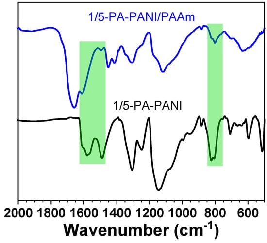 This suggests that the prepared PA-PANI mainly exists in the form of emerald green imine salt rather than the leucoemeraldine (undoped and fully reduced) or permigraniline (doped and fully oxidized) along with the role of PA as an effective dopant [,]. PA-PANI also has a strong signal peak near 827 cm−1, being assigned to the C-H out-of-plane bending vibration of the di-substituted phenyl ring. As for the FTIR spectrum of PA-PANI/PAAm, the absorbance signals of the skeleton stretching vibration of the phenyl ring vary with the view of wavenumber and intensity, in the presence of PAAm.