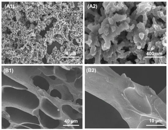 SEM images of PA-PANI (A1,A2) and 1/5-PA-PANI/PAAm cryogels (B1,B2).