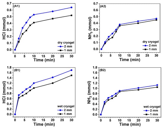 When dry cryogel is encountered, the increase of adsorbed amounts is sharp in 10 min for of both HCl and NH3 gas and then slows down. At the same interval, the adsorbed amount of HCl is larger than that of NH3, even if there exists PA in the cryogel sheets. As expected, the thicker cryogel sheet adsorbs more both gases than the thinner sheet. When wet cryogel is used, the above trends are also observed. Moreover, due to the presence of water, the wet sheets have a significantly higher amount of adsorbed gases than the dry sheet. After 10 min, HCl amount keeps clear increasing.