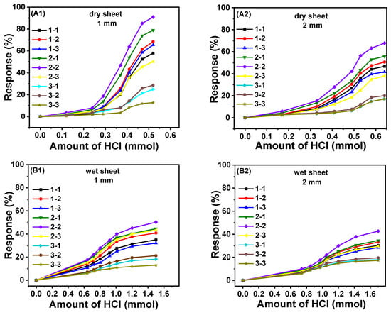 The response of dry and wet cryogel sheets with two thickness ((A1): dry, 1 mm, (A2): dry, 2 mm; (B1): wet, 1 mm, (B2): wet, 2 mm) to adsorbed HCl gas.