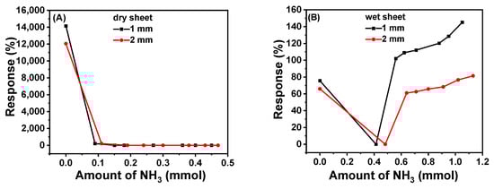 The response of 2-2 cryogel sheet, i.e., 1/4-PA-PANI/PAAm with ANI:AAm at 1:2 in mole, to NH3 gas is shown in Figure 6. It can be seen that the de-doping effect of PANI is more obvious than the doping effect with HCl when dry sheets are used, considering the sharp decrease of response with low gas content. At about 0.1 mmol of NH3 content, the conductivity of both dry sheets with 1 or 2 mm thickness becomes almost zero.