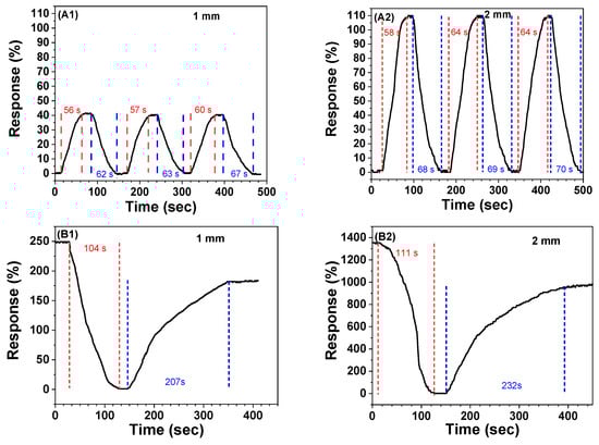 (A) Cyclic response of dry 2-2 cryogel with thickness of 1 mm (A1) and 2 mm (A2) to HCl gas. (B) Response of dry 2-2 cryogel with thickness of 1 mm (B1) and 2 mm (B2) to NH3 gas.