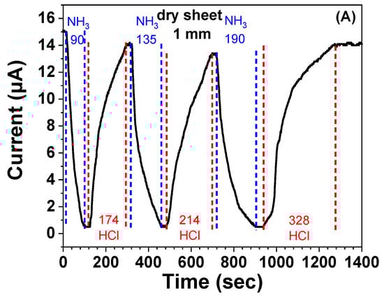 The cyclic response evaluation with alternate charging NH3 and HCl gas has also been performed with 2-2 dry cryogel sheet at 1 mm thickness. The three-cycle result is shown in Figure 8, where the circuit current is used directly to demonstrate the conductivity change. When the circuit current drops to about 0.5 μA with charging NH3 gas, the analysis gas is alternately changed with HCl gas until the increased current does not change within 20 s.