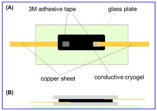 The mold was sealed by covering the upper glass slide and clamping two glass slides. After the mold was kept −25 °C for 48 h, the cryogel sheet was thawed, soaked in water and lyophilized. To fabricate the gas sensor, two copper sheets were fixed onto one cryogel sheet by contacting both surfaces and ends with 3M double-sided adhesive tape. Then, the electrode was kept between two glass plates as shown in Figure 9. For gas detection, the upper glass plate was removed.