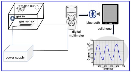 The electrical sensing characteristics of the sensors were measured using a bench system at 10–15 °C, as presented in Figure 10. The system was assembled with the integrated sensor, a OWON digital multimeter [B35T+, Bost, Owon, Zhangzhou, China] connected to cellphone via Bluetooth and a fixed 8 V power supply (UTP3313TFL-Ⅱ, Uni-T, Dongguan, China). The experiment was performed by measuring the circuit current in different gases with various amounts. HCl and NH3 gases were obtained through volatilizing from the 36 wt% hydrochloric acid solution and 25 wt% ammonia solution and pumped with nitrogen flow into the test chamber (22.5 L in volume). The gas inside the chamber was uniformly distributed using a fan. All experiments were performed at room temperature, which was about 10–15 °C, and the humidity was about 26 ± 2 RH%.