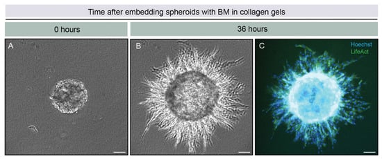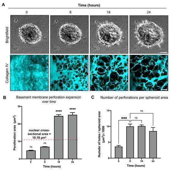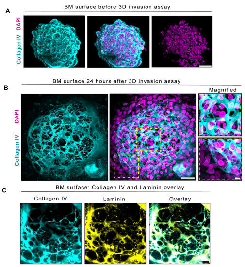 2.2. BM Encapsulated Spheroids before Invasion and Became Extensively Perforated in Our Three-Dimensional In Vitro Invasion Assay