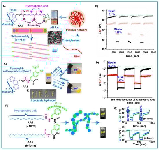 - Reddy, S.M.M.; Shanmugam, G.; Duraipandy, N.; Kiran, M.S.; Mandal, A.B. An additional fluorenylmethoxycarbonyl (Fmoc) moiety in di-Fmoc-functionalized l-lysine induces pH-controlled ambidextrous gelation with significant advantages. Soft Matter 2015, 11, 8126–8140. [Google Scholar] [CrossRef]
