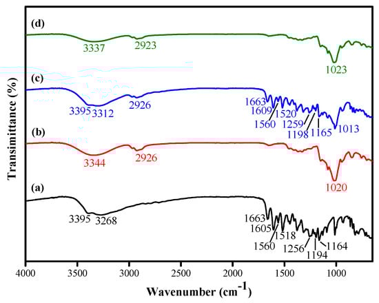 FTIR spectroscopy was used to investigate the successful encapsulation of quercetin into HP-β-CD (Figure 1). The FTIR spectrum of quercetin (Figure 1a) showed –OH groups stretching at 3395 and 3268 cm−1; C=O aryl ketone stretching at 1663 cm−1; C=C aromatic ring stretching at 1605, 1560, and 1518 cm−1; and C–O aryl ether ring stretching, C–O phenol stretching, and C–CO–C ketone stretching and bending at 1256, 1194, and 1164 cm−1, respectively []. For HP-β-CD (Figure 1b), the characteristic broad peak of OH group stretching was shown at 3344 cm−1; C–H stretching was detected at 2926 cm−1; and C-O-C glucose unit stretching occurred at 1020 cm−1 []. The FTIR spectrum of the physical mixture of the two (Figure 1c) showed characteristic peaks of quercetin, including C=O aryl ketone stretching (1663 cm−1), C=C aromatic ring stretching (1609, 1560, and 1520 cm−1), and C–CO–C ketone stretching and bending (1165 cm−1), as well as C–O–C glucose unit stretching of HP-β-CD. When quercetin was encapsulated, its characteristic peaks seemed to be masked (Figure 1d). The C=O aryl ketone stretching (1663 cm−1), C=C aromatic ring stretching (1605, 1560, and 1518 cm−1), and C–CO–C ketone stretching and bending (1164 cm−1) peaks of quercetin were absent in the inclusion complex, which may be because the quercetin was entrapped in the HP-β-CD cavities []. Signals of the characteristic bands of quercetin shifted from 3282 cm−1 to 3142 cm−1 O–H bending signals showing the formation of quercetin/HP-β-CD inclusion complex [].