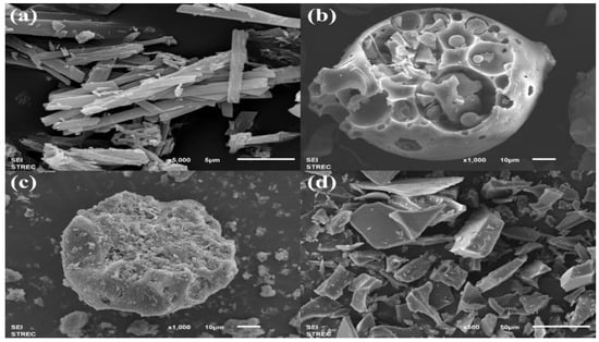 The morphologies of quercetin, HP-β-CD, and quercetin/HP-β-CD physical mixture and inclusion complex were observed at different magnifications on SEM (Figure 3). Quercetin (Figure 3a) presented a strip-like structure with a smooth surface [], while HP-β-CD (Figure 3b) appeared as rough spheres []. In the physical mixture (Figure 3c), both quercetin and HP-β-CD kept their own structure, with particles of HP-β-CD embedded with quercetin particles []. On the other hand, the morphology and shape of quercetin/HP-β-CD inclusion complex obtained from the solvent evaporation method were completely different from those of the original product (Figure 3d). Our results were consistent with Pradhan et al. [] in that the morphology of Berberis anthocyanin-loaded CD inclusion complex revealed the rod shape. The encapsulation of quercetin with CD demonstrated the electrostatic and hydrogel bond interactions between quercetin and CD.