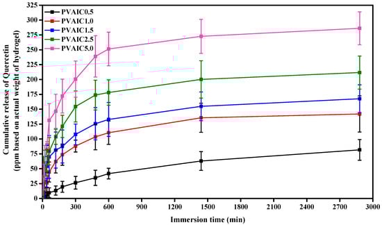 The characteristics of quercetin release from the prepared hydrogels were investigated using the total immersion method over a period of 48 h in PBS (pH = 7.4) and incubated at 37 °C under continuous stirring. The cumulative release of quercetin from all hydrogels was calculated using Equation (5) and reported in parts per million. As shown in Figure 5, the cumulative amount of quercetin released from the hydrogels increased rapidly with increasing immersion time for the first 5 or 8 h of the experiment, then gradually increased and reached a plateau. After a period of 48 h, the cumulative quercetin quantities released from the quercetin/HP-β-CD inclusion complex PVA hydrogels were 81.66 ± 17.42, 142.07 ± 30.43, 167.64 ± 23.30, 211.74 ± 27.78, and 286.10 ± 27.71 ppm for PVAIC0.5, PVAIC1.0, PVAIC1.5, PVAIC2.5, and PVAIC5.0, respectively. The greatest cumulative amounts of CIP released were observed when the quercetin concentration of PVAIC5.0 was used, and therefore, it can be concluded that when a greater concentration of quercetin is introduced to the nanoparticles, the drug release will increase. In the USA, the mean quercetin intake was approximately 14.90 to 16.39 mg per day []. Thus, the release characteristics of quercetin for the PVAIC5.0 hydrogels (close to 28.6 mg/100 g of sample) was found to be about 1.9-times higher than the oral solution of the quercetin intake per day.