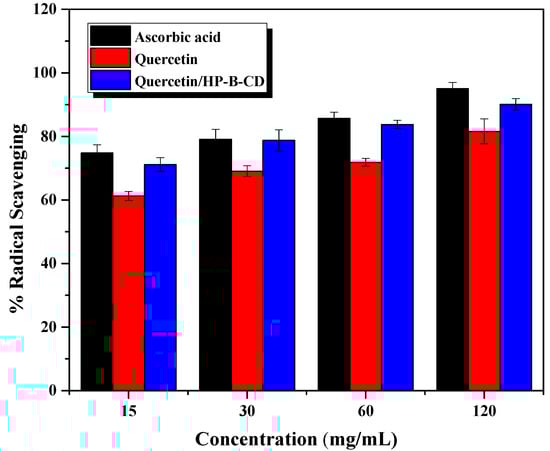 The antioxidant activity of free quercetin and quercetin/HP-β-CD inclusion complex was evaluated using 2, 2-diphenyl-1-picrylhydrazyl (DPPH) free radical scavenging assay following []. First, quercetin and quercetin/HP-β-CD in various concentrations (15, 30, 60, and 120 µg/mL) were dissolved in methanol. Then, the samples (1 mL) were mixed with 3 mL DPPH solution (0.1 mM in methanol). The mixture was incubated for 30 min in the dark. Finally, the absorbance of the reaction mixture was measured using a microplate reader at 517 nm. Radical scavenging activity (%) was calculated using the following equation. Ascorbic acid was used as a standard and all analyses were performed in triplicate: