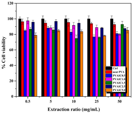 The indirect cytotoxicity evaluation of all samples toward NCTC 929 clone cells investigated the potential use of drug loaded PVA hydrogels as wound dressing material. Figure 7 shows the viability of cells obtained from MTT assay after being cultured with various concentrations of media extracted from neat PVA hydrogel as blank PVA, and PVA hydrogels loaded with quercetin/HP-β-CD inclusion complex (PVAIC0.5, PVAIC1.0, PVAIC1.5, PVAIC2.5, and PVAIC5.0) compared with that obtained after cells were cultured with fresh SFM. According to the in vitro cytotoxicity standard, a reduction of cell viability by more than 30% is considered a cytotoxic effect []. The viability of NCTC 929 clone cells with all extraction medium concentrations, i.e., neat PVA, PVAIC0.5, PVAIC1.0, PVAIC1.5, PVAIC2.5, and PVAIC5.0, were 92.7–96.3, 76.8–88.2, 80.0–97.5, 74.7–92.9, 87.6–96.8, and 78.3–85.3%, respectively. Cell viability was higher than 70% in all prepared hydrogels loaded with quercetin/HP-β-CD inclusion complex. Therefore, all hydrogels loaded with quercetin/HP-β-CD inclusion complex with extraction medium concentrations of 0.5, 5, 10, 25, and 50 mg/mL had cell viability of more than 70%, indicating that these conditions were non-cytotoxic, and the hydrogels have potential in wound dressing applications.