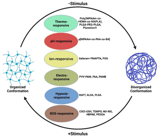 Hydrogels are water-enriched polymeric biomaterials used as scaffolds that mimic the extracellular matrix and are employed in various tissue engineering applications [6]. Interestingly, the hydrogels can be tuned by altering the functional groups of the parent polymeric backbone, resulting in structural rearrangements depending on the physiochemical alterations in the surrounding medium and forming intelligent/smart/stimuli-responsive hydrogels. Intelligent hydrogels alter their physiochemical structure in response to environmental factors such as temperature, pH, hypoxia, ischemia, and the presence of reactive oxygen species (ROS) [7]. Moreover, intelligent hydrogels possess a multitude of applications in regenerative cardiology, from controlled drug release to direct implantation onto the left ventricle (LV) for post-MI cardiac tissue repair [8]. Furthermore, intelligent hydrogels have considerable potential for cardiac tissue repair due to the complexity of post-ischemic environments. For instance, the hydrogel-based delivery of angiogenic factors such as basic fibroblast growth factor (bFGF) and angiopoietin-1 (Ang-1) promotes angiogenesis and significantly improves cardiac healing [9]. Electro-responsive and ion-responsive matrices have been utilized and directly implanted onto post-ischemic left ventricles of animal models as patches to provide conductive and structural support to the area [10]. Generally, the base polymer utilized determines the responsive function of the hydrogel matrix in vivo [11]. At the target site, intelligent hydrogels react appropriately in response to their environment [11]. The major approaches and the commonly used polymers for designing intelligent hydrogels for cardiac applications are displayed in Figure 1 and Figure 2, respectively, and Table 1.